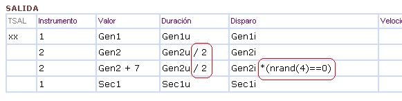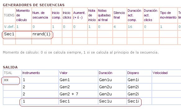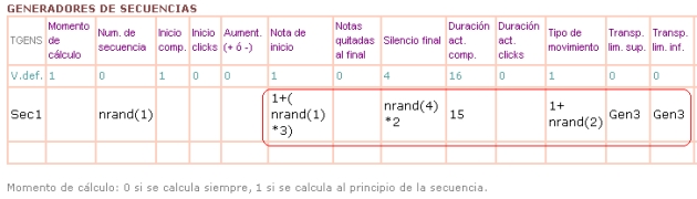 - Como puede apreciarse, ahora la melodía contiene los fragmentos melódicos de nuestras secuencias, en una sucesión aleatoria. Se encuentran separados por un silencio de negra. Este "Silencio Final" es una de las casillas de configuración de los Generadores de Secuencias. Se expresa en semicorcheas, y por defecto vale 4. Puede modificarse desde 0 (todas las secuencias aparecerían seguidas, sin separación) hasta un valor elevado. |